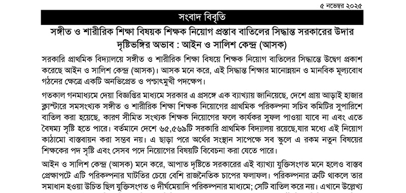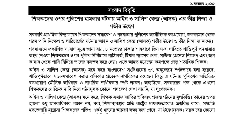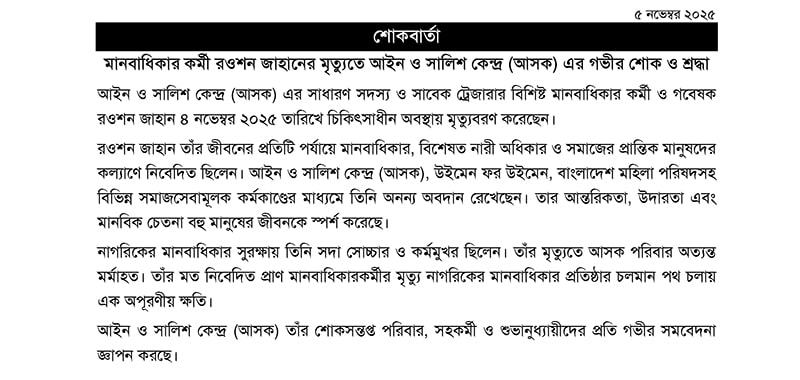 In August 2025, Ain o Salish Kendra (ASK) has taken 28 human rights violation cases into consideration and collected data regarding these incidents. Besides that, ASK has communicated the journalists, administrations and the law enforcing agencies to collect data regarding those incidents. ASK has contacted 15 victims of torture and their family members to collect primary data for assistance. ASK has collected follow-up information regarding the cases which were filed in the court earlier. ASK has contacted with family members ...