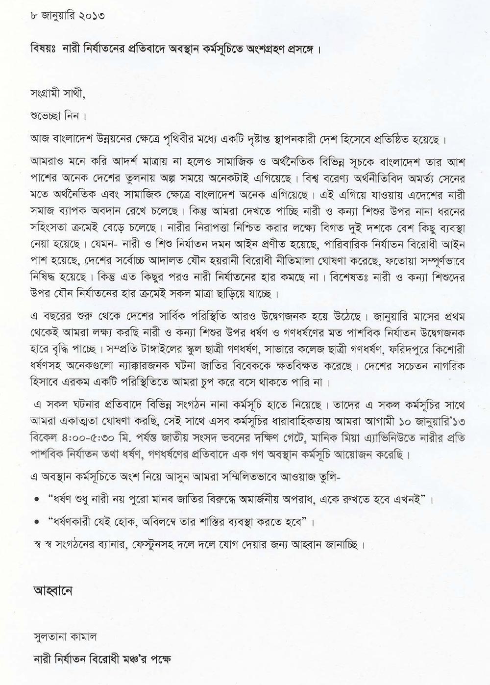Nari Nirjaton Birodhi Moncho is going to organise a Human Chain protesting ongoing violence against women on 10 January 2013 at 4.00-5.30 pm at Manik Mia Avenue (South gate of the National Parliament).