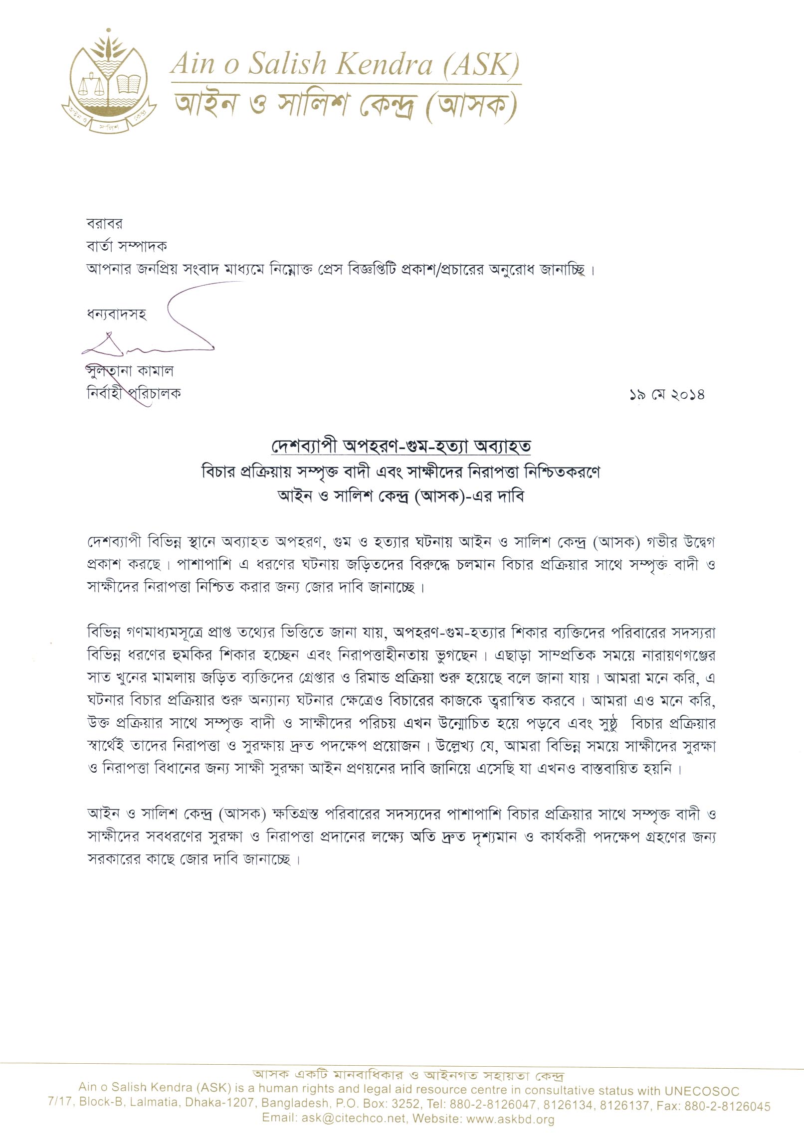 19 May 2014. Ain o Salish Kendra (ASK) expresses grave concern over uninterrupted incidents of abduction, kidnap and murder in various places around the country. ASK strongly demands immediate measures to ensure security of the petitioners and witnesses connected with the trial process against the persons allegedly involved in these types of incidents.