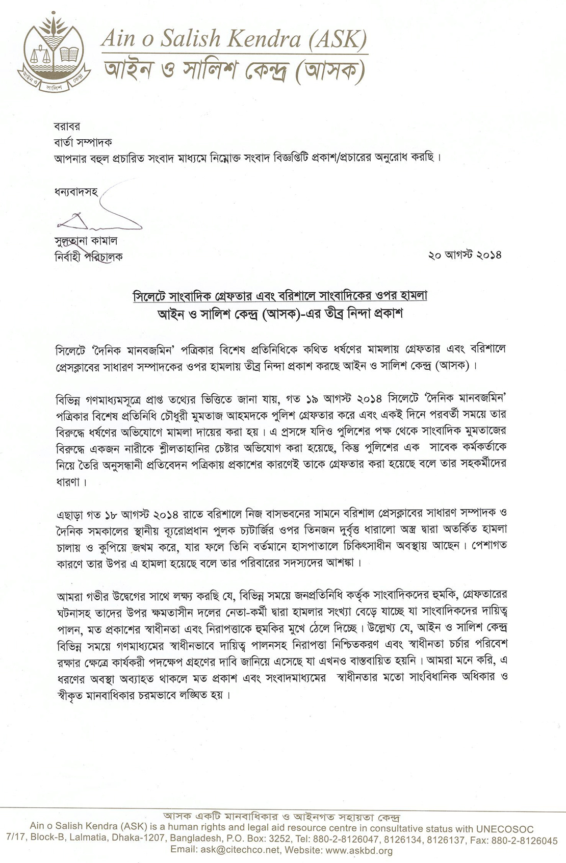 Ain o Salish Kendra (ASK) condemns the arrest of special correspondent of ‘Daily Manobjomin’ in Sylhet under the charge of an alleged rape and also the assault on the general secretary of Barisal press club.