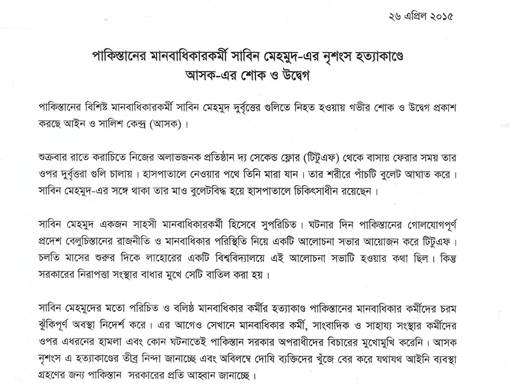 Ain o Salish Kendra (ASK) expresses deep condolence and grave concern over the killing of noted Pakistani activist Sabeen Mehmud.