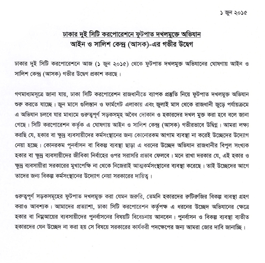 Ain o Salish Kendra (ASK) expresses its deep concern over the commencement of City Footpath eviction drive from 1 June 2015.