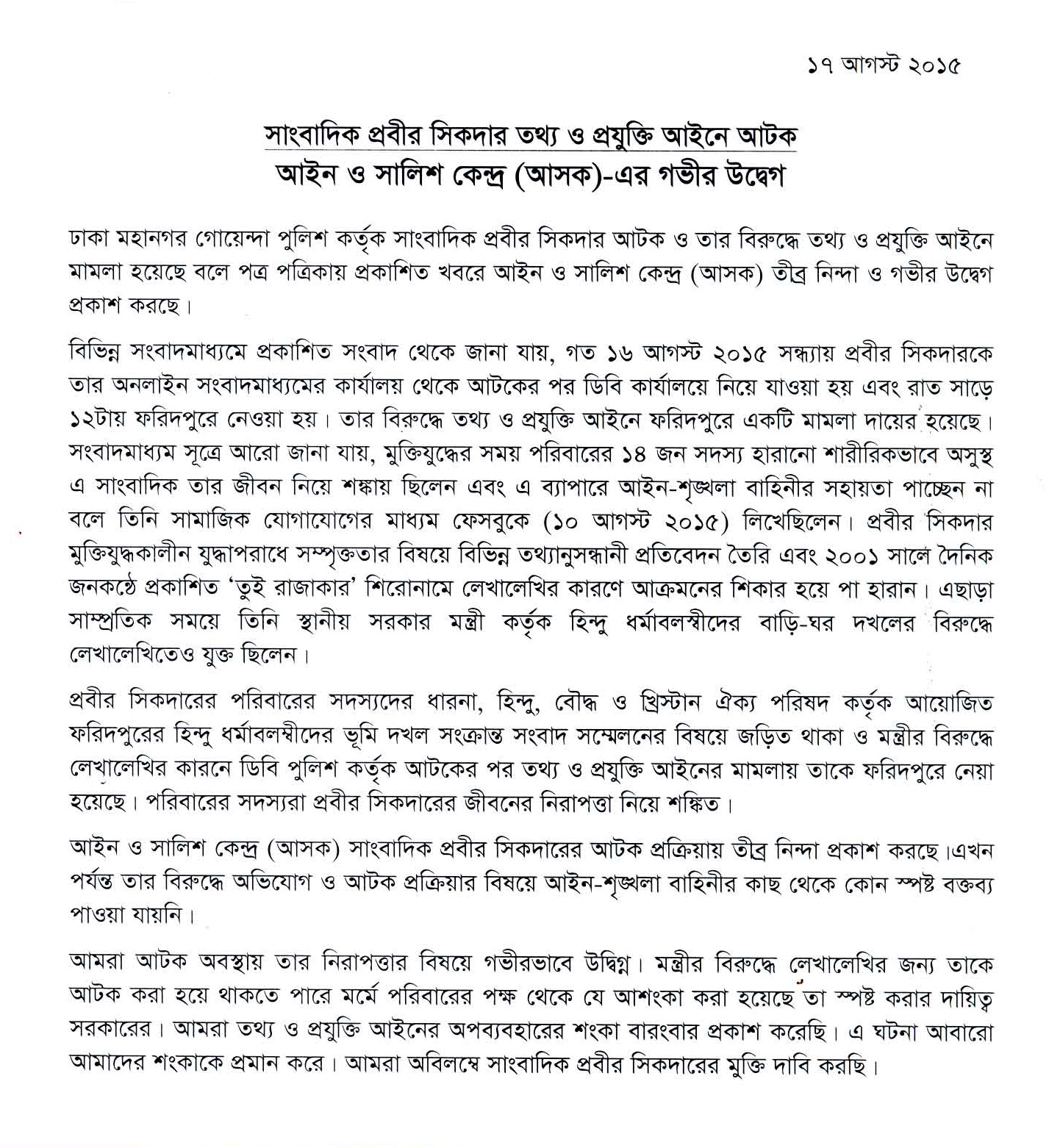 Earlier, ASK expressed its concern several times about the misuse of the ICT Act. This incident again proved our fear. We demand the immediate release of Journalist Probir Sikdar.
