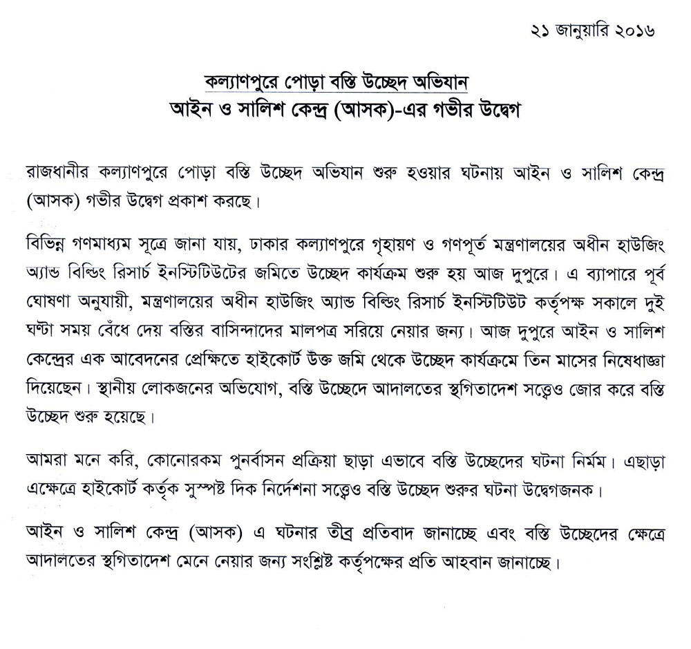 Ain o Salish Kendra strongly condemns the incident of eviction drive and urges the authorities concerned to comply with the stay order issued by the High Court.