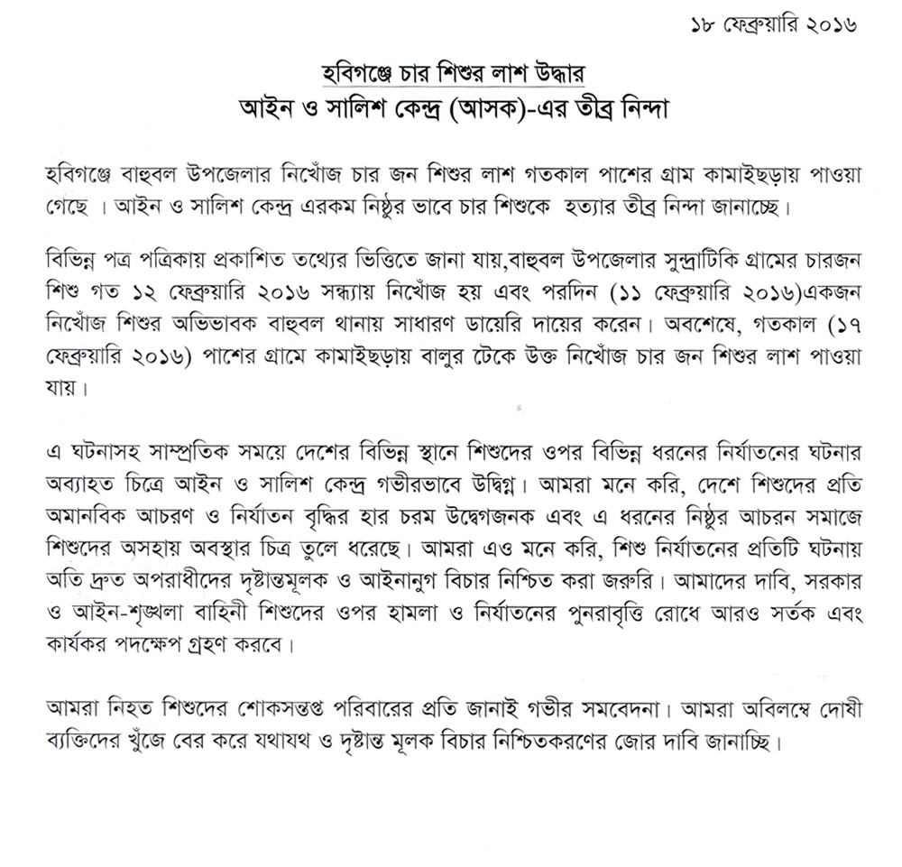 The bodies of four children, who went missing from Sundratiki village situated in Habiganj’s Bahubal upazila, were found in Kamaichhara village on 17 February 2016. Ain o Salish Kendra (ASK) strongly condemns the brutal murder of these children.