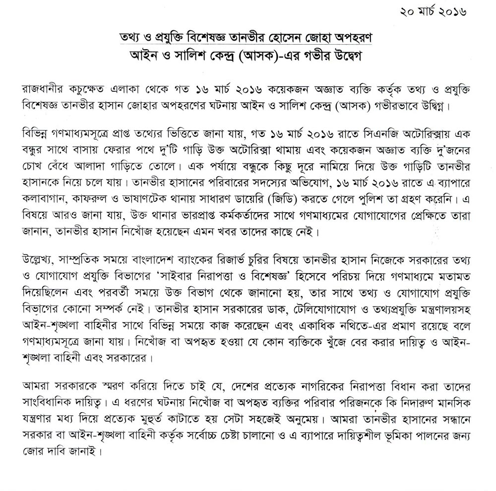 ASKs' grave concern on the Abduction of IT Expert Tanvir Hasan Zoha