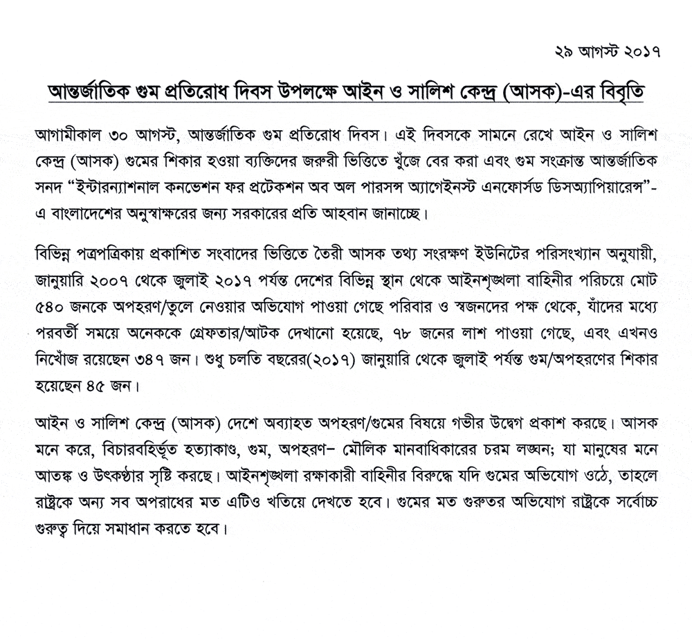 International day of the victims of enforced disappearances : ASK expresses grave concern