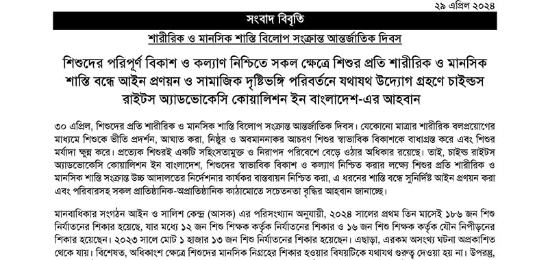 ত্রৈমাসিক শিশু অধিকার প্রতিবেদন, এপ্রিল-জুন ২০২৪
